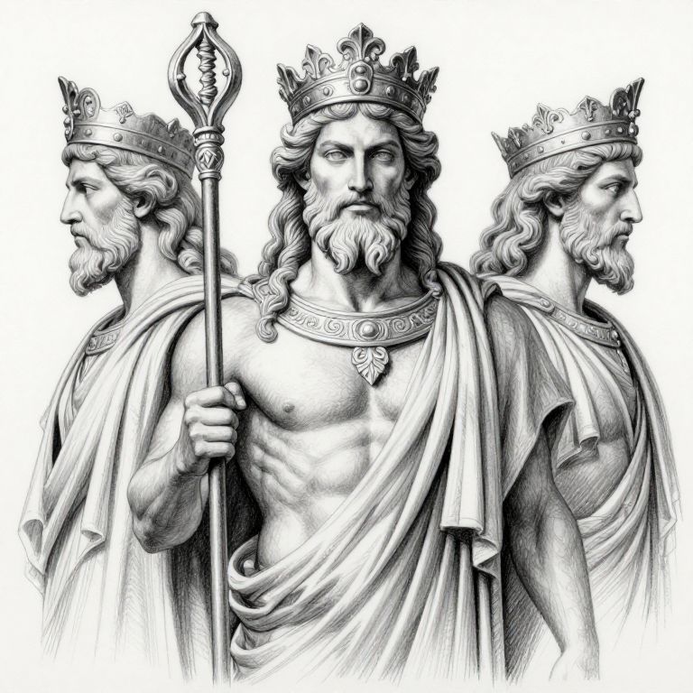 The image is a highly detailed pencil drawing featuring three figures, each representing a god from Greek mythology. The central figure, a muscular god with long, flowing hair and a beard, holds a staff adorned with intricate designs. He is dressed in a flowing robe and wears a crown with elaborate decorations. To the left and right of the central figure are two smaller, side profiles of gods, each with distinct crowns and beards. The overall composition is balanced, with the central figure being the focal point, while the side profiles provide a sense of depth and perspective. The use of black lines and shading creates a dramatic and realistic effect, highlighting the textures and contours of the gods' faces and clothing. The image is a testament to the artist's skill in capturing the essence of these mythological figures with a high level of detail and illusionistic depth.