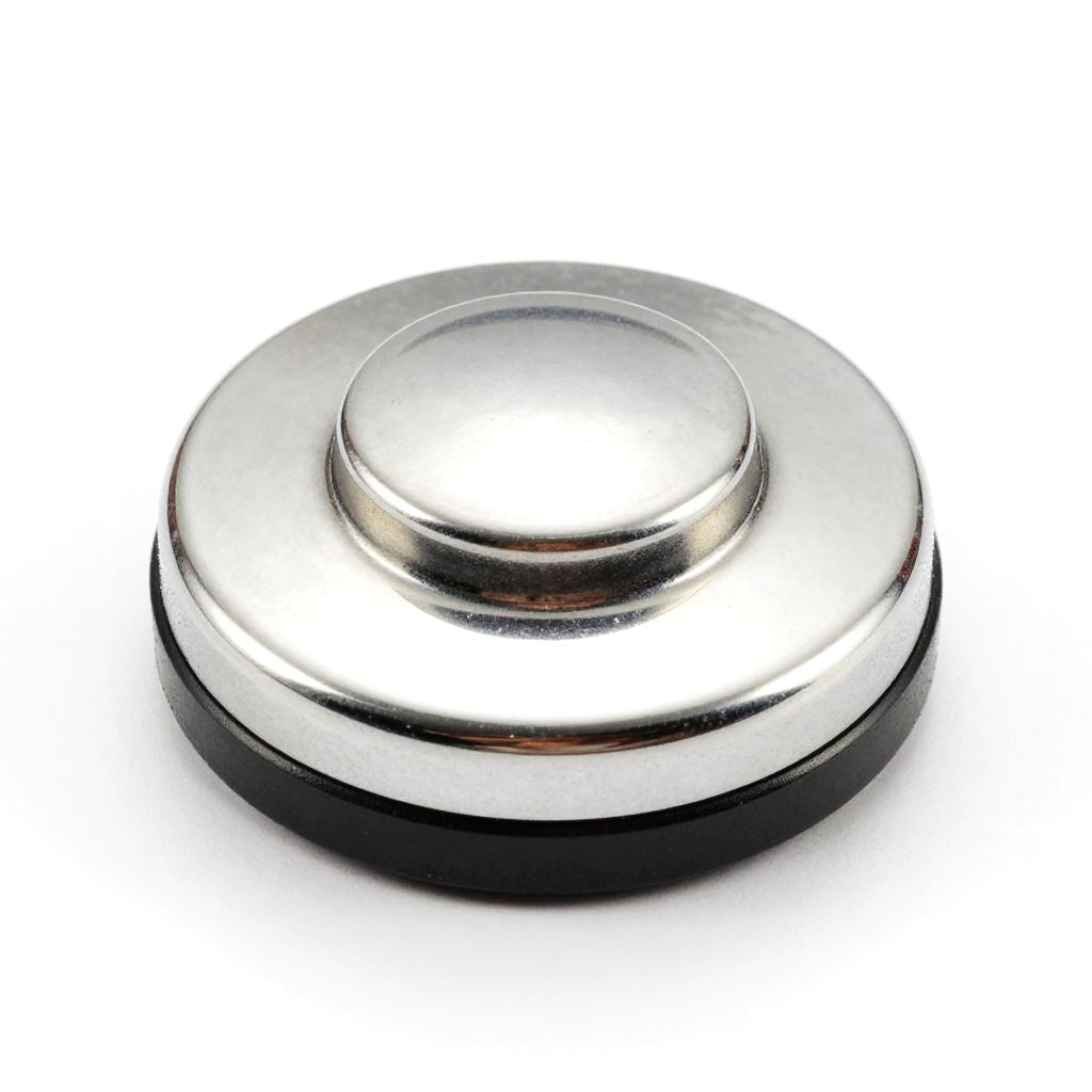 Classic handheld buzzer with a shiny metal button, isolated on a white background, hyper-realistic with precise reflections and textures, focus on intricate metalwork and button mechanism, minimalist composition