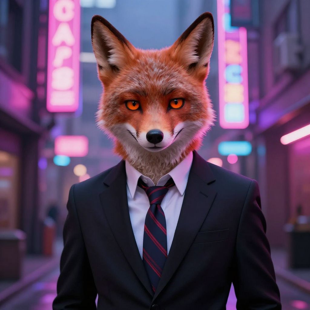 Digital artwork of an anthropomorphic fox character wearing a black suit, white shirt, and dark tie with red stripes. The fox has orange eyes and neatly groomed fur, set against a vibrant neon-lit urban alleyway with pink and purple signs.