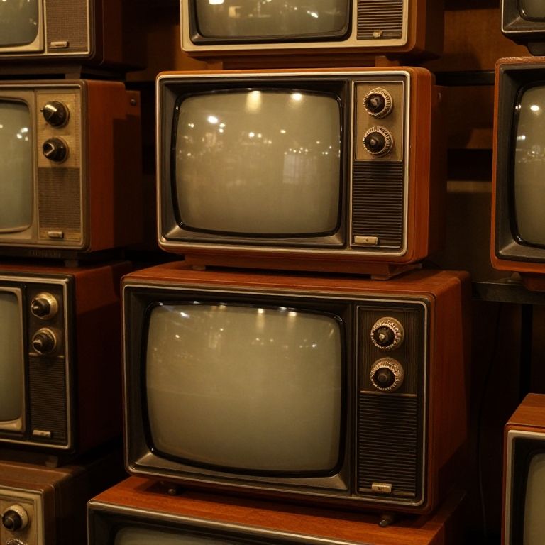 Photograph of vintage, wooden-framed televisions stacked and arranged in a store or warehouse. The TVs, with rounded screens and black-and-brown exteriors, feature two dials on the right side and speaker grilles on the top and bottom. The screens are slightly reflective, showing blurred reflections of overhead lights. The background is filled with more stacked televisions, creating a dense, nostalgic atmosphere. The image has a warm, amber-toned filter, enhancing the retro feel. The televisions are uniformly placed, with some on top of others, and the overall texture is smooth with a glossy finish on the wooden exteriors.