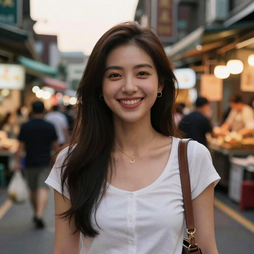 Beautiful Taiwanese women smiling warmly, street market background in Taipei at sunset, vibrant colors, ultra-detailed portrait