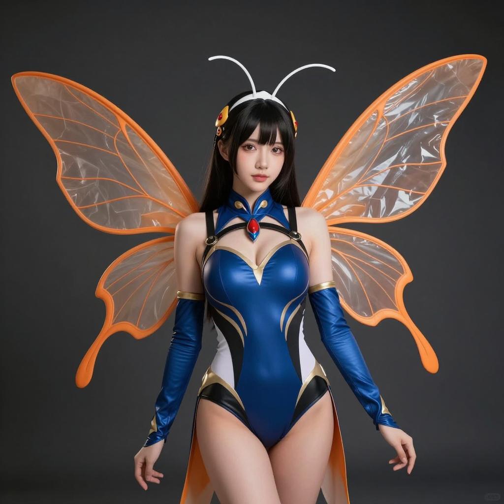 Young woman wearing a detailed Mothra-inspired cosplay costume featuring a sleek, form-fitting blue and black bodysuit with intricate patterns. She has large, sheer orange and black wings resembling those of a moth and delicate white antennae headpiece, set against a dark background.