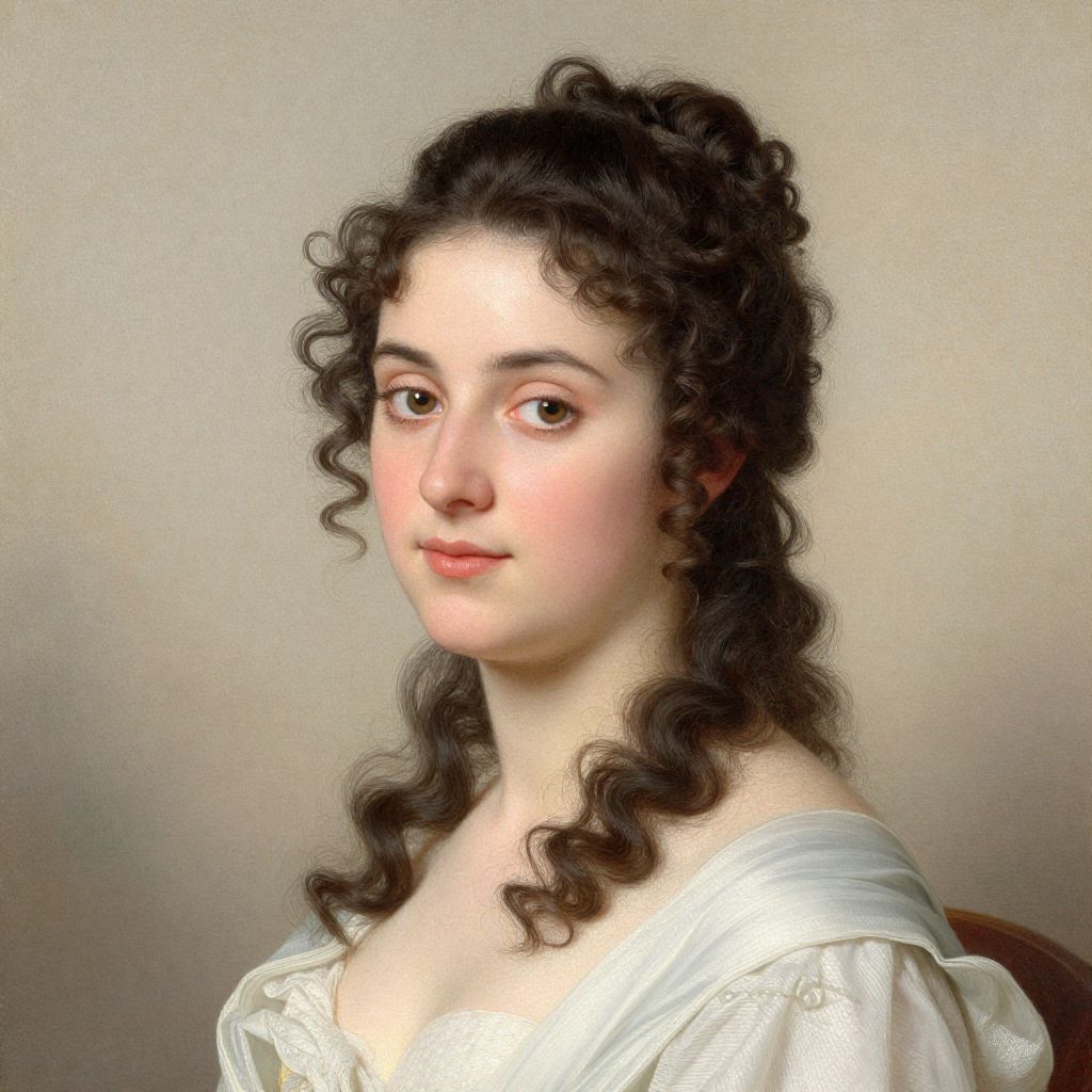 A classical portrait painted in a neoclassical style, featuring a young woman with dark, curly hair styled in an elegant Regency-era fashion, rendered in soft, pastel tones with meticulous attention to detail and a serene, timeless quality.