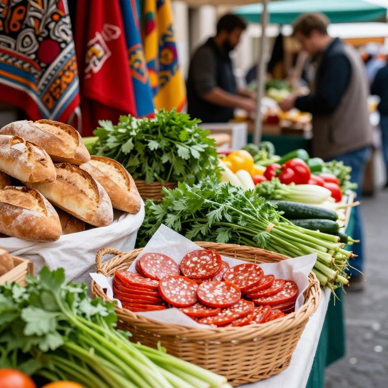 Vibrant market photograph: baskets of fresh bread, parsley, cucumber, sliced salami, tomatoes; blurred vendors in background; colorful textiles.