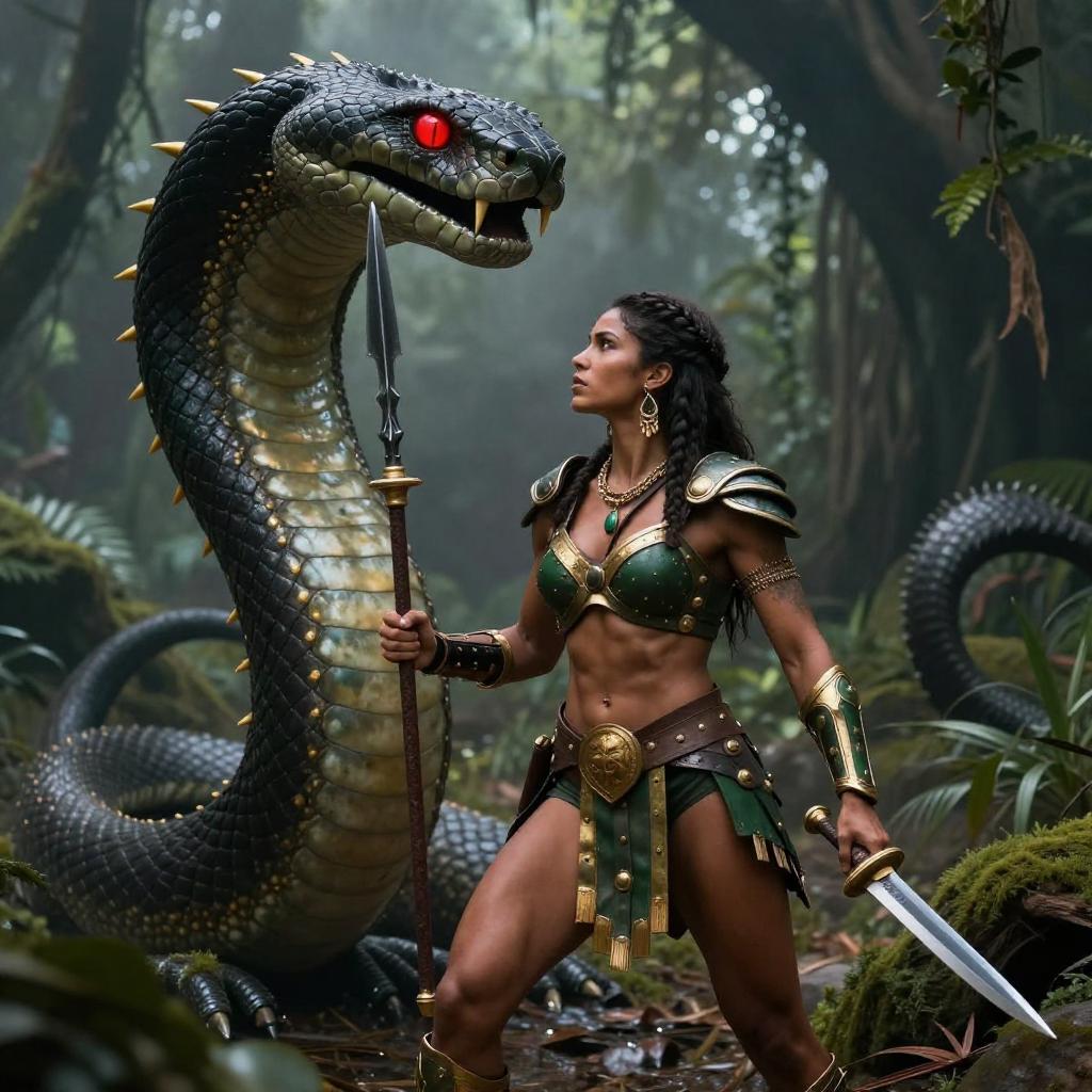 Hyper-realistic image of a muscular female Amazon warrior clad in green and gold armor, holding a spear and dagger, standing ready in a dark, misty jungle background. She faces an enormous, black-scaled jungle serpent beast with glowing red eyes and sharp golden spikes, captured in a dynamic showdown with dramatic lighting and deep shadows.