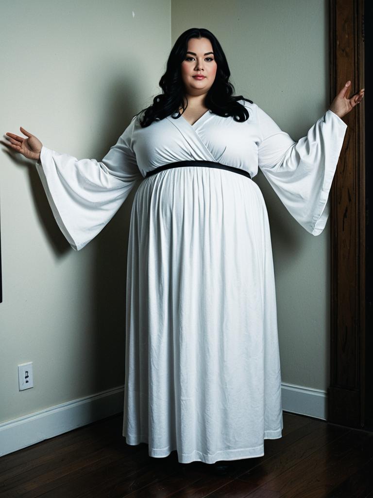 Plus size goddess costume, solo, standing, fine art parody, indoors, male focus, 1boy, black hair, full body, wide sleeves, realistic, looking at viewer, long sleeves