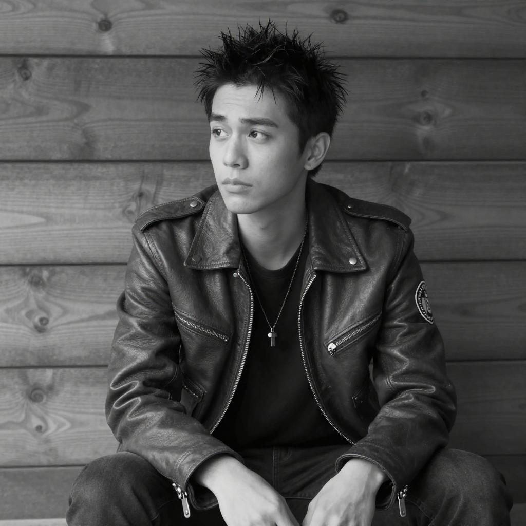 Black-and-white photograph of a young man with spiky hair, wearing a dark leather jacket with a patch on the left side, a necklace, and a dark shirt. He sits against a wooden wall, looking slightly to the left with a neutral expression. His hands rest on his lap.