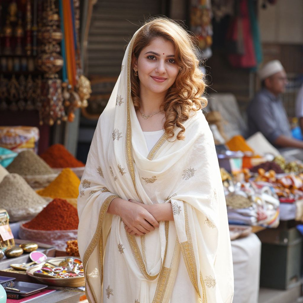 A young women with fair skin, light brown curls, and a warm smile wearing a delicate Paithani dupatta in ivory with golden border and subtle lotus patterns, standing in a colorful marketplace in Nashik with vendors selling spices and handcrafted items, the dupatta fluttering in a gentle breeze, realistic photography style with natural lighting.