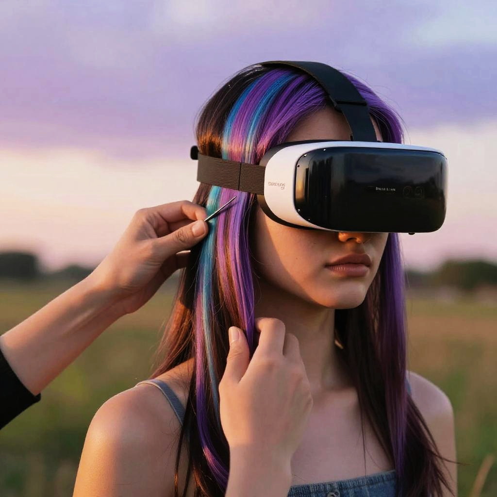 A creative scene where a free hair color changer is applied in augmented reality, displaying various vivid hair hues on a model outdoors under sunset light, vibrant skies, realistic shadows, high-detail facial features, futuristic and immersive technology feel.