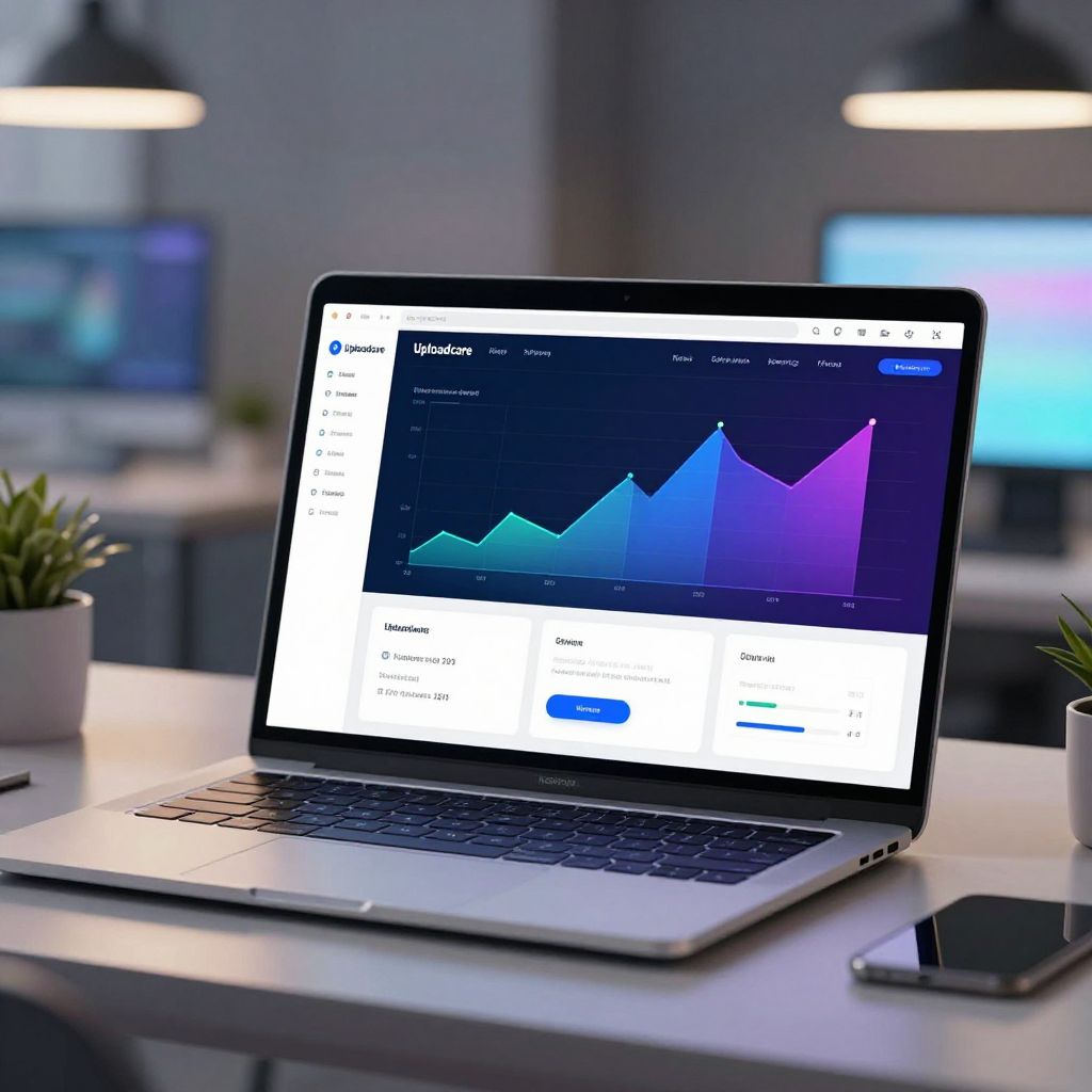 Uploadcare review concept featuring a modern tech workspace with a laptop displaying Uploadcare dashboard, vibrant graphs, user interface elements, smooth digital file upload processes, futuristic style, soft glowing light, high-tech ambiance, professional and clean layout.