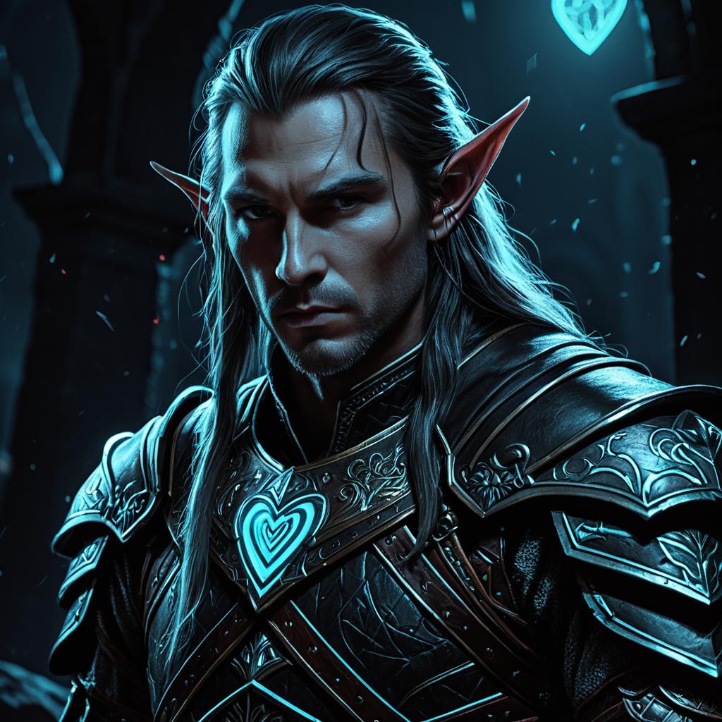 Super close-up portrait of a tall elf warrior with pointed ears, long hair, and facial markings, dressed in ancient, intricately detailed dark leather armor featuring glowing neon blue accents in a heart shape. The image showcases high-definition, atmospheric lighting and cinematic composition, capturing a dramatic and intense expression, set against a dark fantasy background.