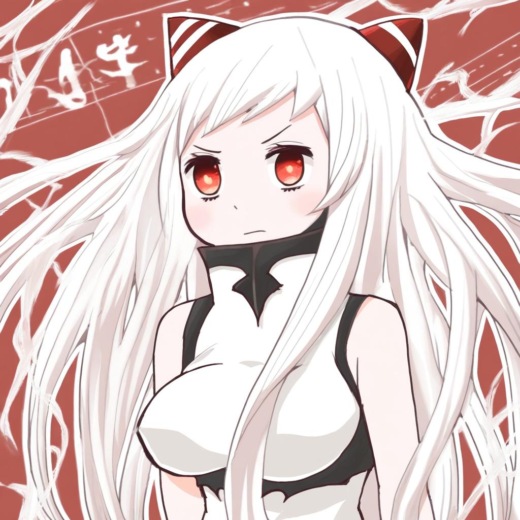 Airfield princess, kantai collection, 1girl, white skin, pale skin, horns, red eyes, white hair, very long hair, long hair, large breasts, by artist jetto komusou, leet