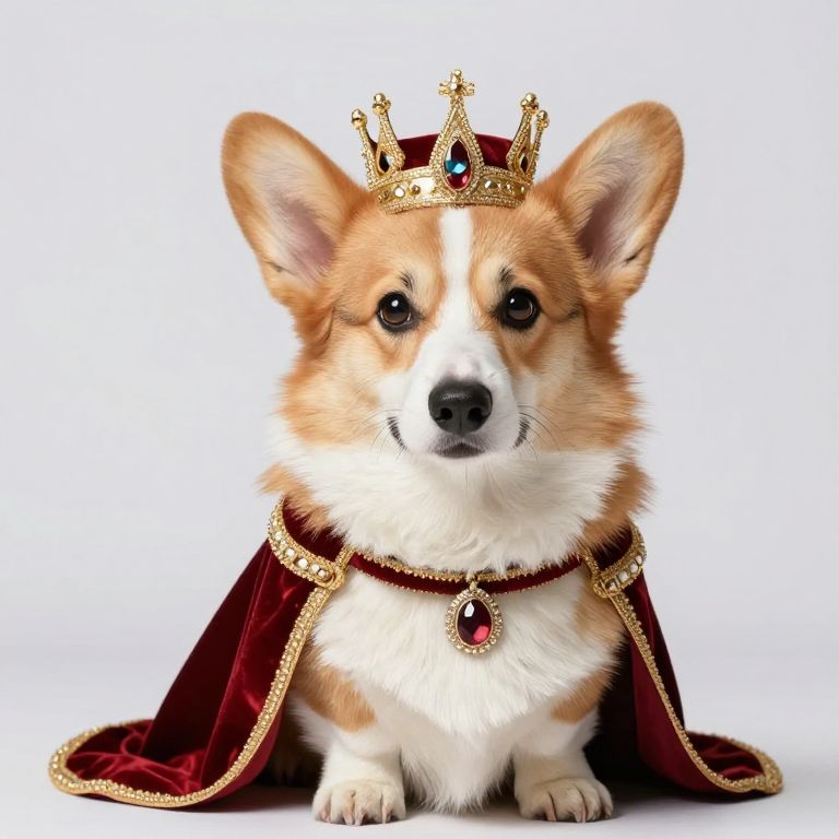 Regal serenity meets playful innocence in this portrait of a Pembroke Welsh Corgi adorned as royalty, embodying the timeless grace of leadership and the warmth of unwavering loyalty.