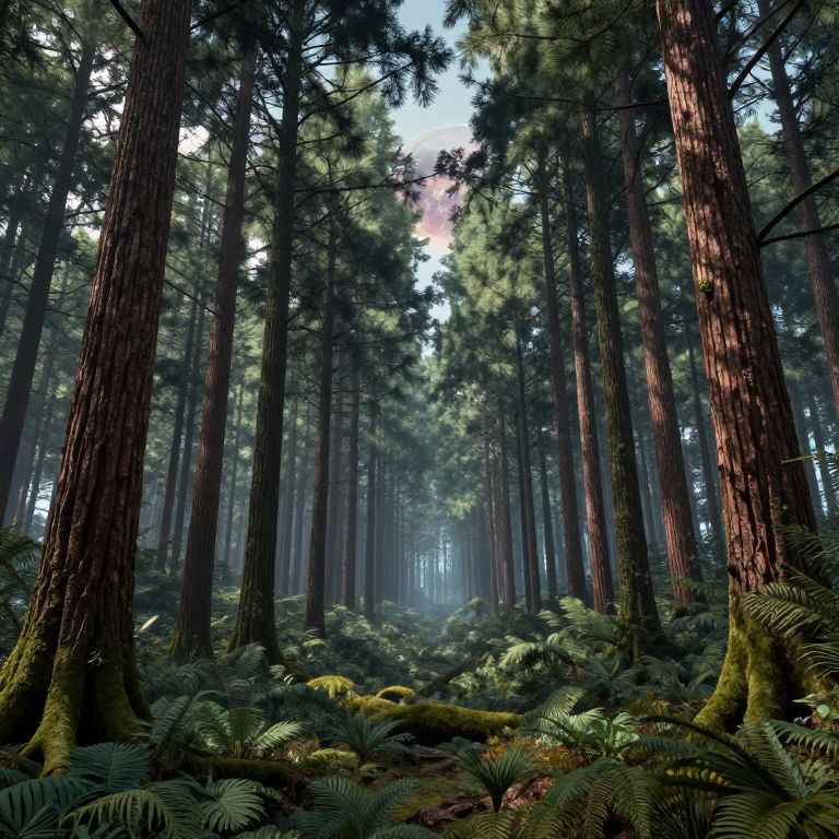 Photograph of a serene redwood forest with tall, towering trees, sunlight filtering through, and lush green ferns covering the forest floor.