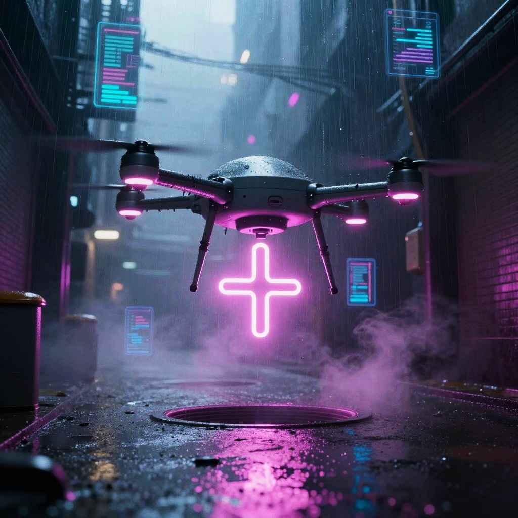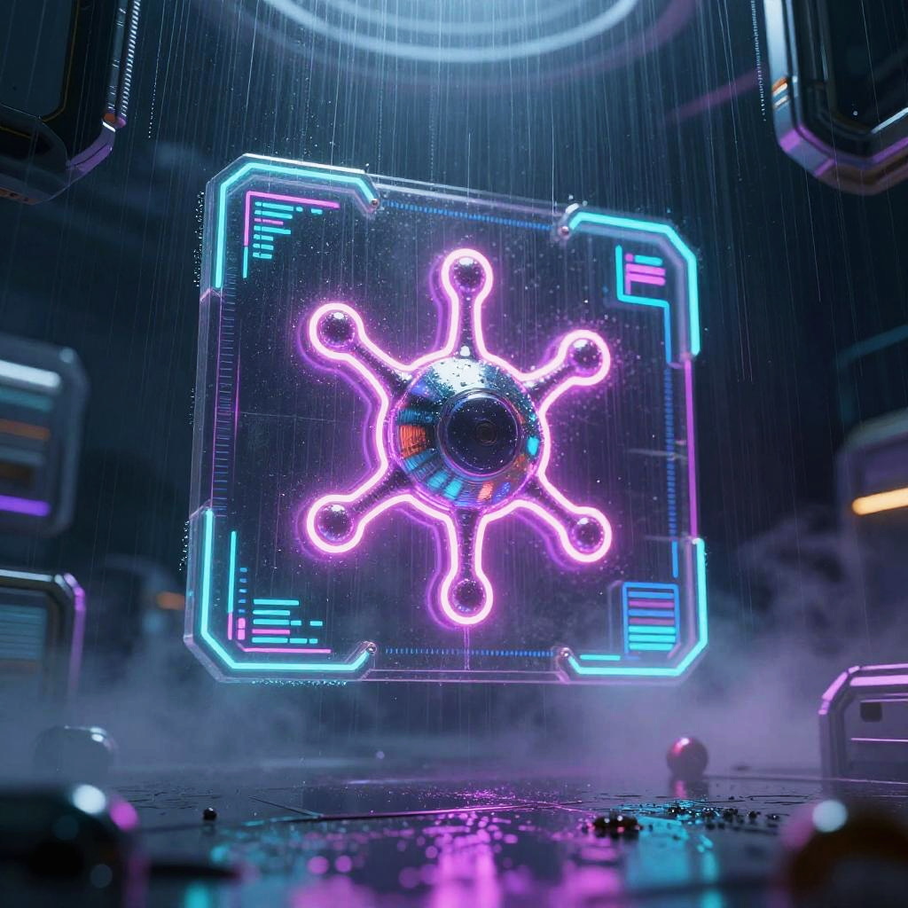 Plasma node array neon glyph embedded within suspended drone port in storm-swollen neon harbor, digital rain cascading across translucent UI panes, iridescent highlights, wet materials, micro-scratches, volumetric fog, god rays, soft bloom, particle drift, moody reflections; crisply detailed futuristic unreal vision, vibrant cyan–magenta palette, high contrast lighting, ray-traced reflections and refractions, 4K detail, cinematic composition, shallow depth of field, film grain, dynamic shadows, precise color grading, SDXL render
