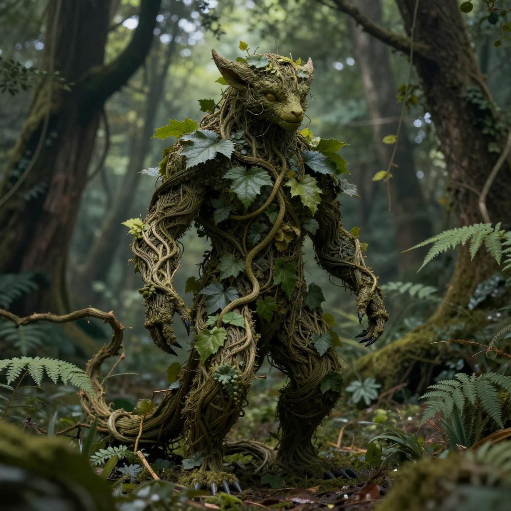 High-resolution image of a mysterious forest creature composed entirely of vines and leaves, designed in a Romantic artistic style. The creature features intricate intertwining branches and lush green foliage with natural lighting and a modern chiaroscuro effect enhancing the depth and detail in a dark forest environment.