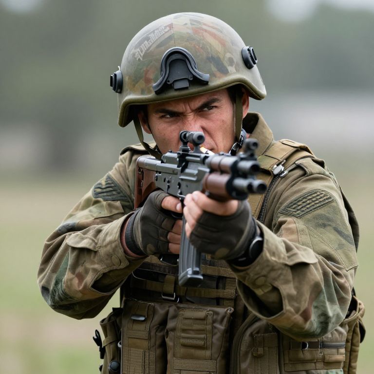 Photograph of a male soldier in full camouflage military gear, including a helmet with a black visor and fingerless gloves. He is aiming a black rifle with both hands, his focused expression showing determination. The soldier's uniform includes an American flag patch on his left shoulder. The background is blurred, featuring green and gray hues, suggesting an outdoor, possibly forested, setting. The soldier's face is partially obscured by the helmet and the rifle's barrel is prominently in the foreground, creating a sense of immediacy and action.
