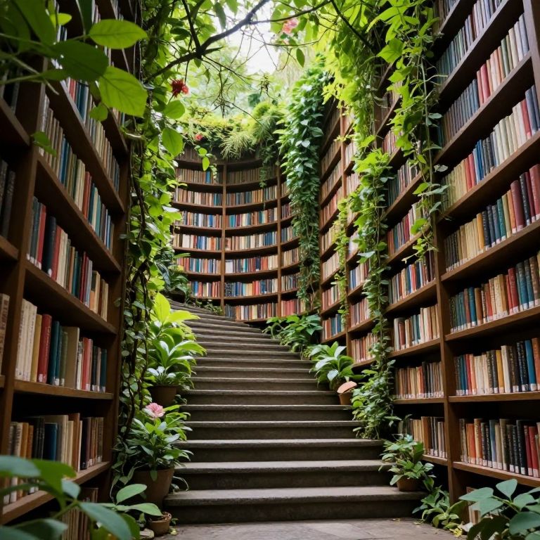 Photograph of a lush, indoor library with towering wooden bookshelves on both sides, filled with colorful books. A narrow staircase ascends in the center, flanked by vibrant green plants and vines cascading from the ceiling and shelves. Sunlight filters through the leaves, illuminating the scene. The library has a serene, almost magical atmosphere with a mix of natural and architectural elements. The shelves are uniformly aligned, creating a symmetrical, inviting pathway. The overall color palette includes rich browns, greens, and the varied hues of book spines.