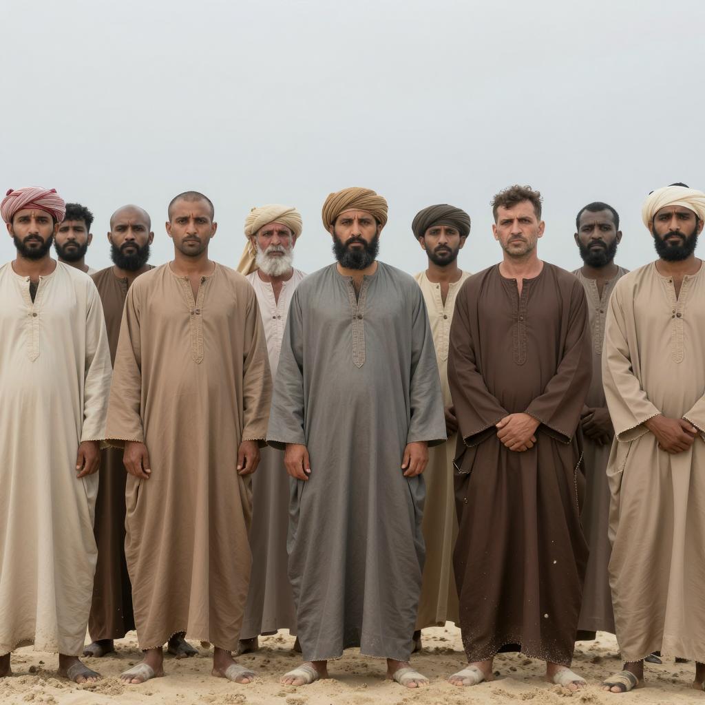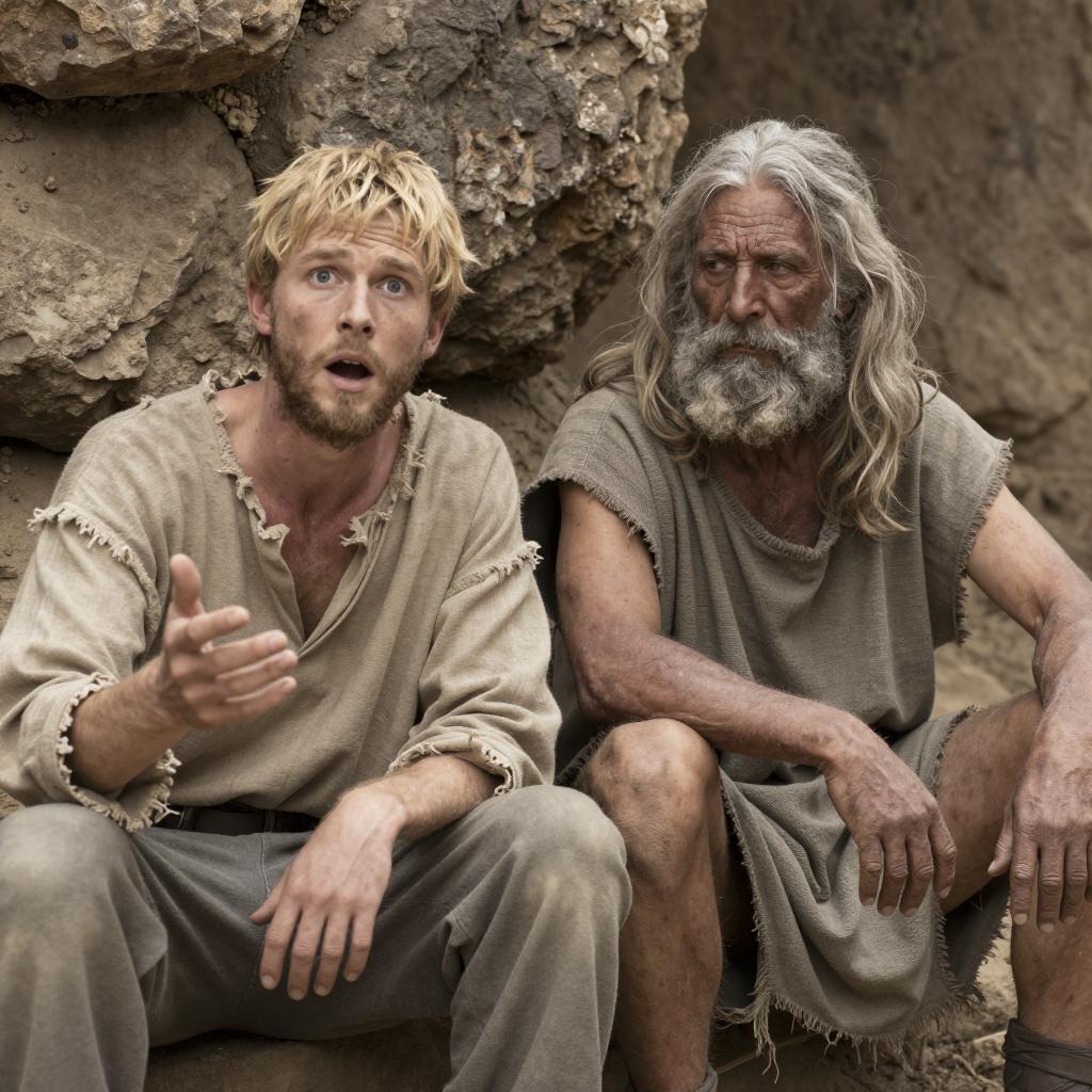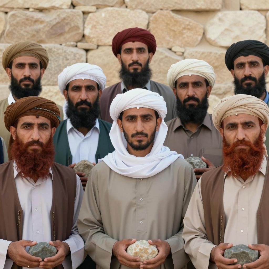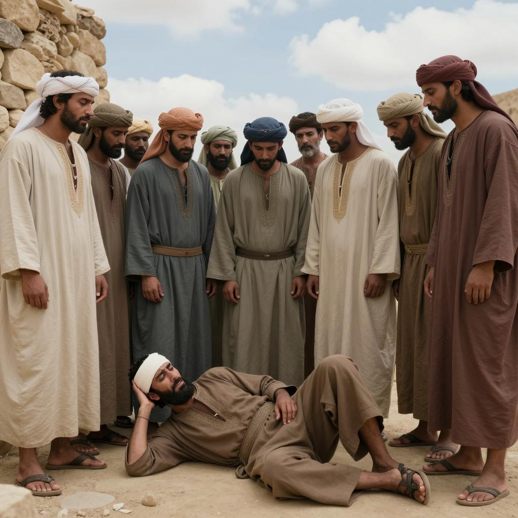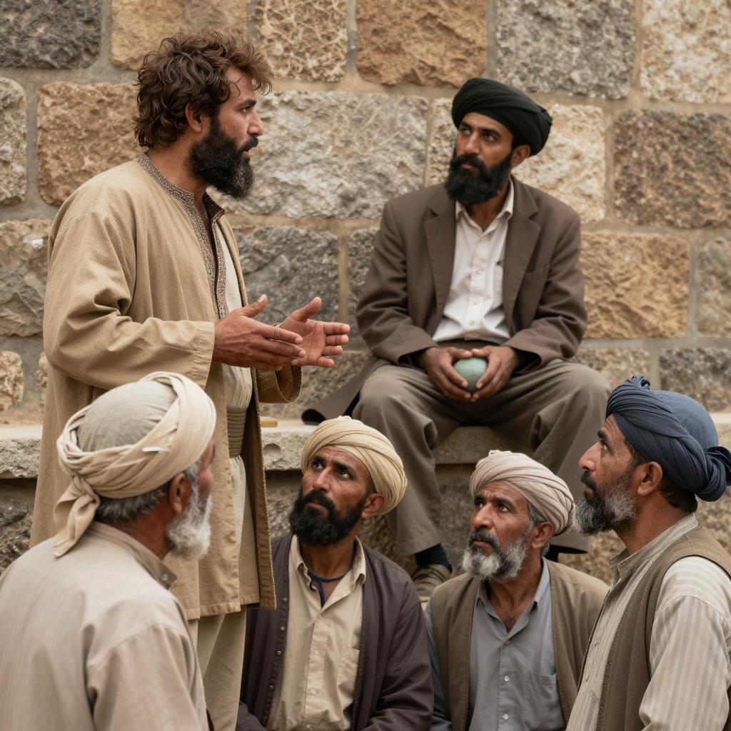 Bearded man with shaggy hair and tan clothes stands on stone wall, speaking to four men with headscarves and various head coverings. One man with dark beard and brown coat sits on wall, holding a ball. Stone wall background. Men in front look up at speaker. Bearded man on left wears headscarf and tunic. Bearded man on right wears striped shirt. All men have rugged, worn appearances. Daylight scene.