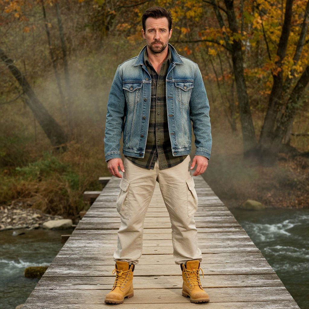 Photograph of a bearded man in a denim jacket, plaid shirt, beige pants, and tan boots, standing on a wooden bridge in a