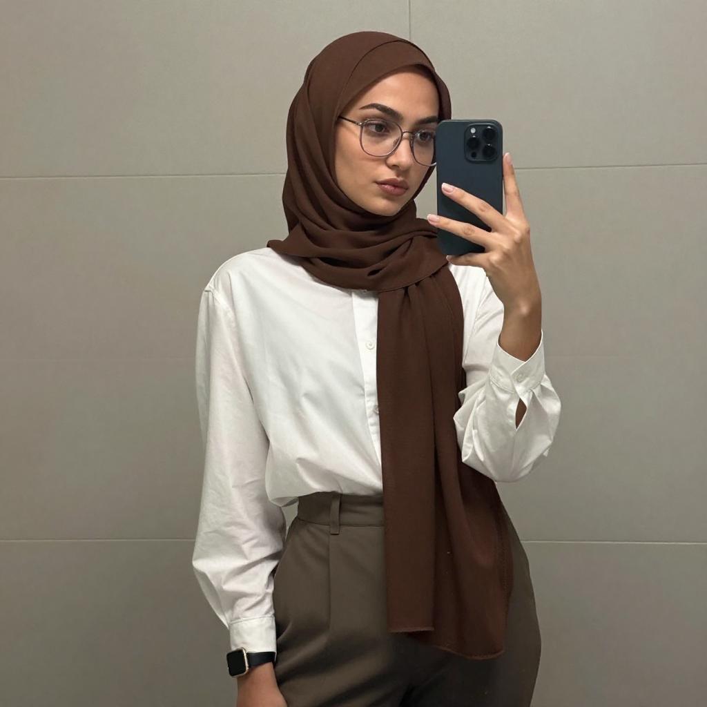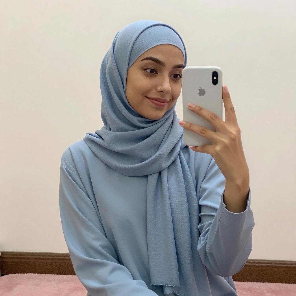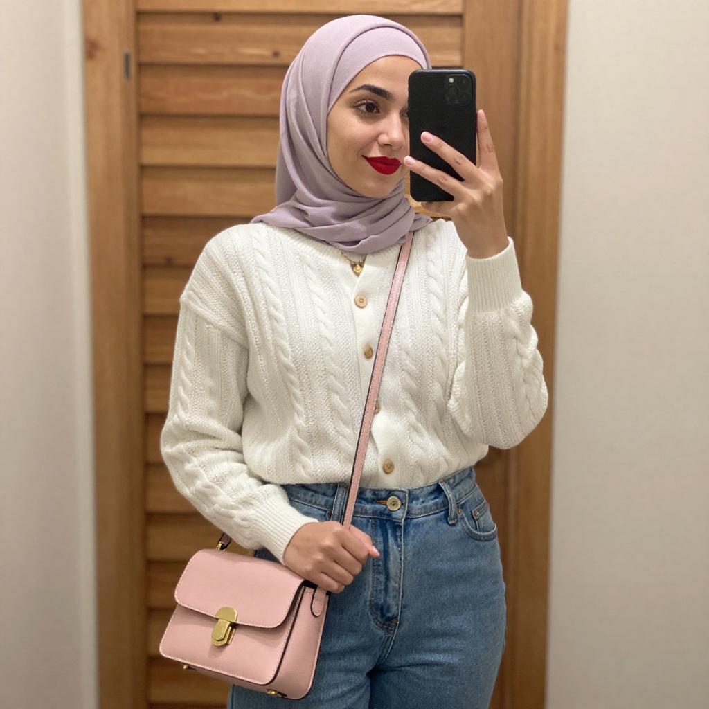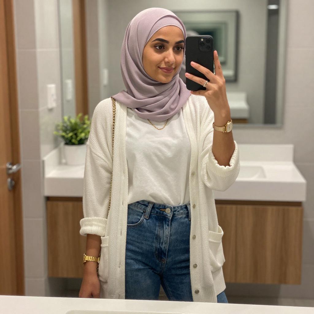 Photograph of a young woman taking a mirror selfie in a modern bathroom. She wears a light purple hijab, white cardigan, white shirt, and high-waisted blue jeans. She holds a black smartphone in her right hand and has gold jewelry, including a necklace and watch. The background includes a wooden vanity with a white sink and a potted plant.