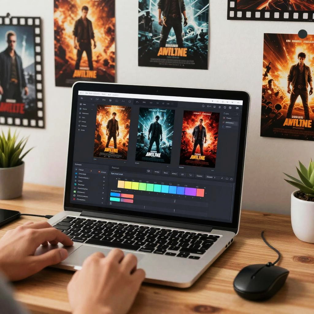 Movie poster maker app on laptop screen, creative professional editing hands on keyboard and mouse, vibrant movie poster previews around the laptop, modern workspace with film-themed decorations, high resolution digital art, inspiring and innovative atmosphere