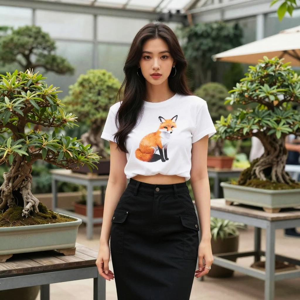 A willowy woman in a casual urban style, wearing a printed white crop top featuring a fox graphic and a high-waisted black midi skirt with pockets, stands in an indoor botanical garden bonsai exhibit, surrounded by lush greenery and delicate bonsai trees, in the visual style of JC Staff. Sexy. Pretty face and beutiful eyes