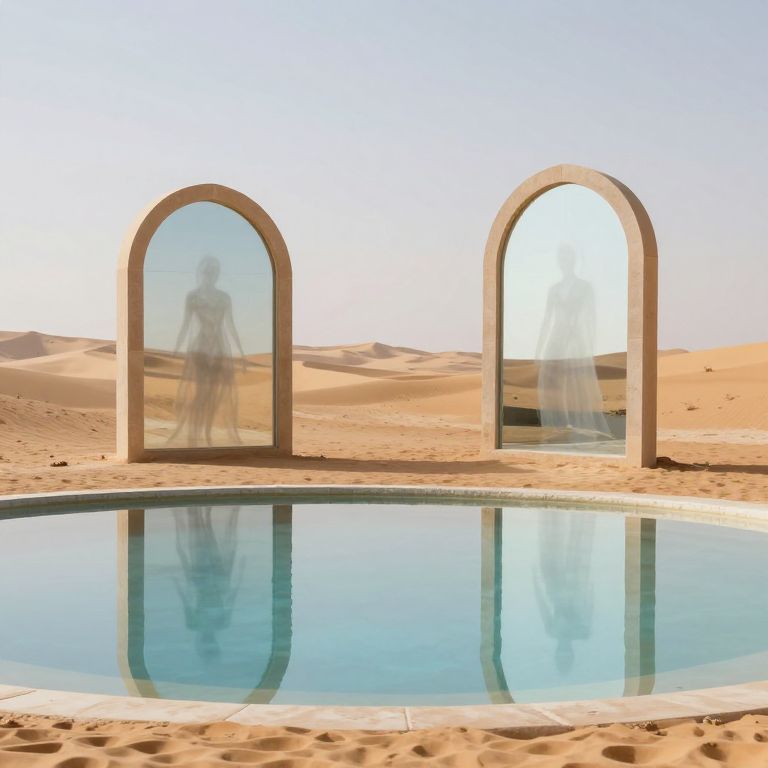 In a desolate desert, two mirrored arches stand sentinel over a tranquil pool, each reflecting not mere images, but ethereal figures whose forms blur the line between reality and memory, as if capturing fragments of forgotten souls who once sought solace in this shimmering oasis.