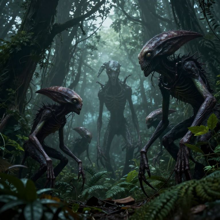 Digital illustration of a dark, misty forest with four menacing, alien creatures with elongated heads and skeletal features, lurking among dense foliage. Creepy
