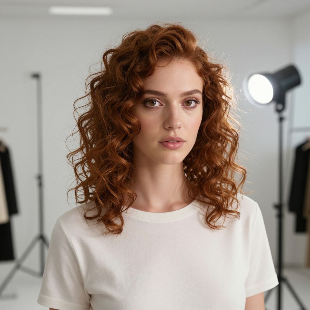 A realistic photograph of a model with curly auburn hair and warm hazel eyes standing in a bright, spacious fashion studio, where a high-powered studio flash is angled toward her face, creating gentle highlights on her cheeks and catching the subtle reflection of the light on her eyeshadow and clothing in a professional studio setting.