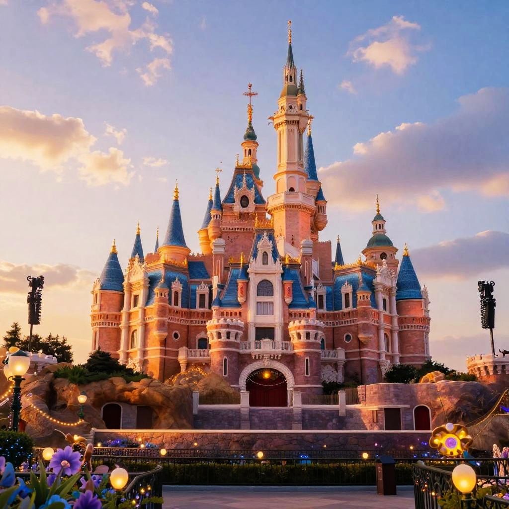 AI image generator creating a magical Disney-inspired fairytale castle at sunset, surrounded by sparkling lights and enchanted forests, whimsical and colorful atmosphere, cinematic lighting, vibrant and dreamy style