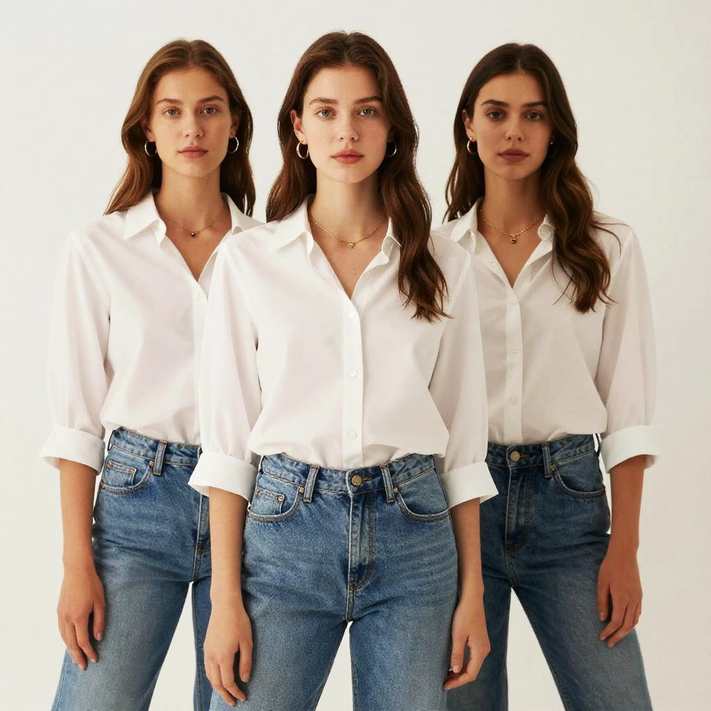 Ladies Sleeve Blouses, woman in white shirt and jeans posing for a picture