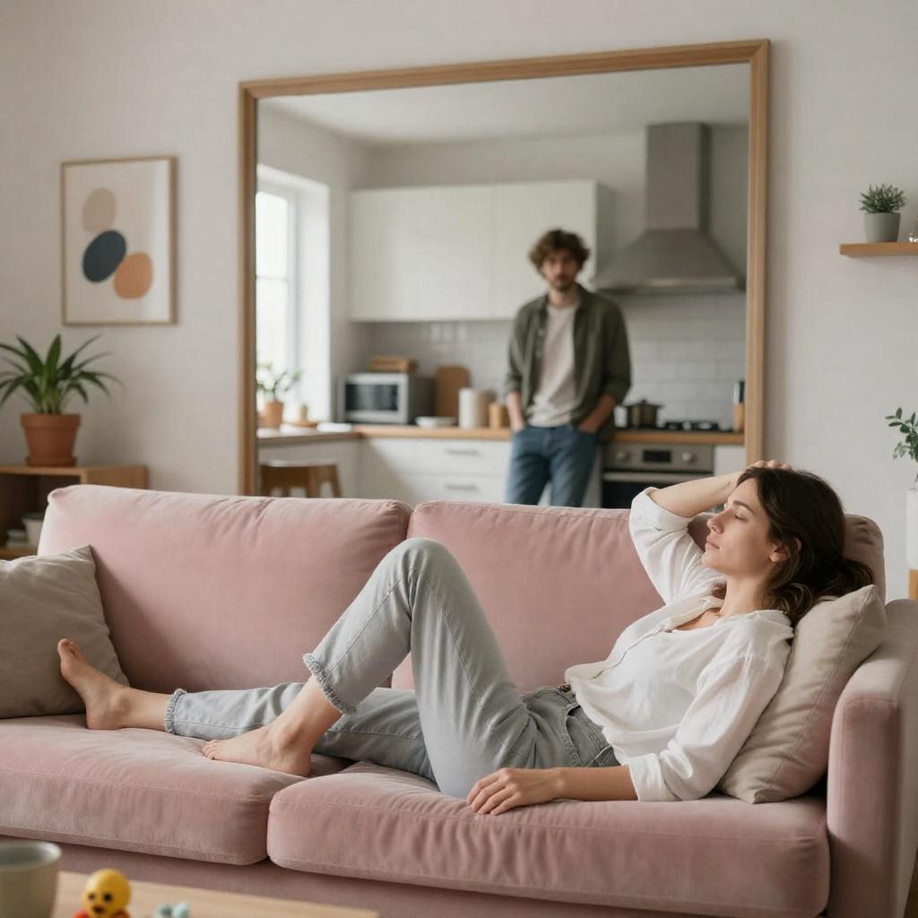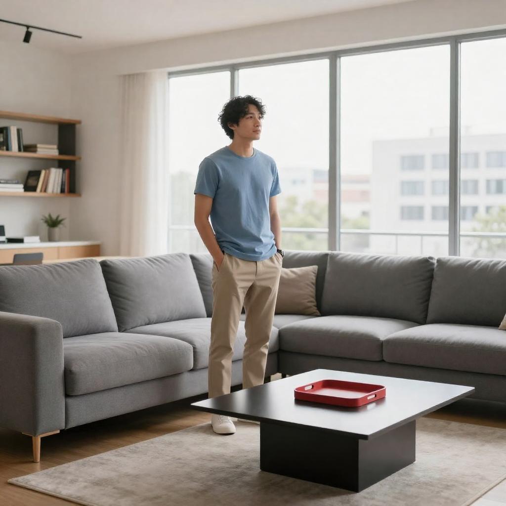 Photograph of a modern living room with a man standing near a gray sectional sofa. He wears a light blue t-shirt and beige pants. Large windows behind him let in bright natural light, revealing a cityscape outside. The room features a dark coffee table, a red tray, and a wooden floor. Shelves with books are on the left.