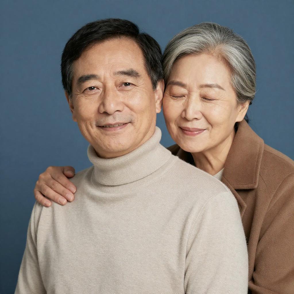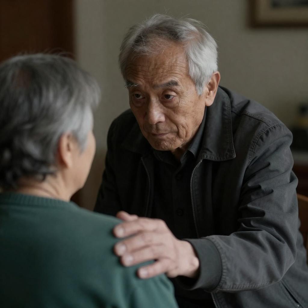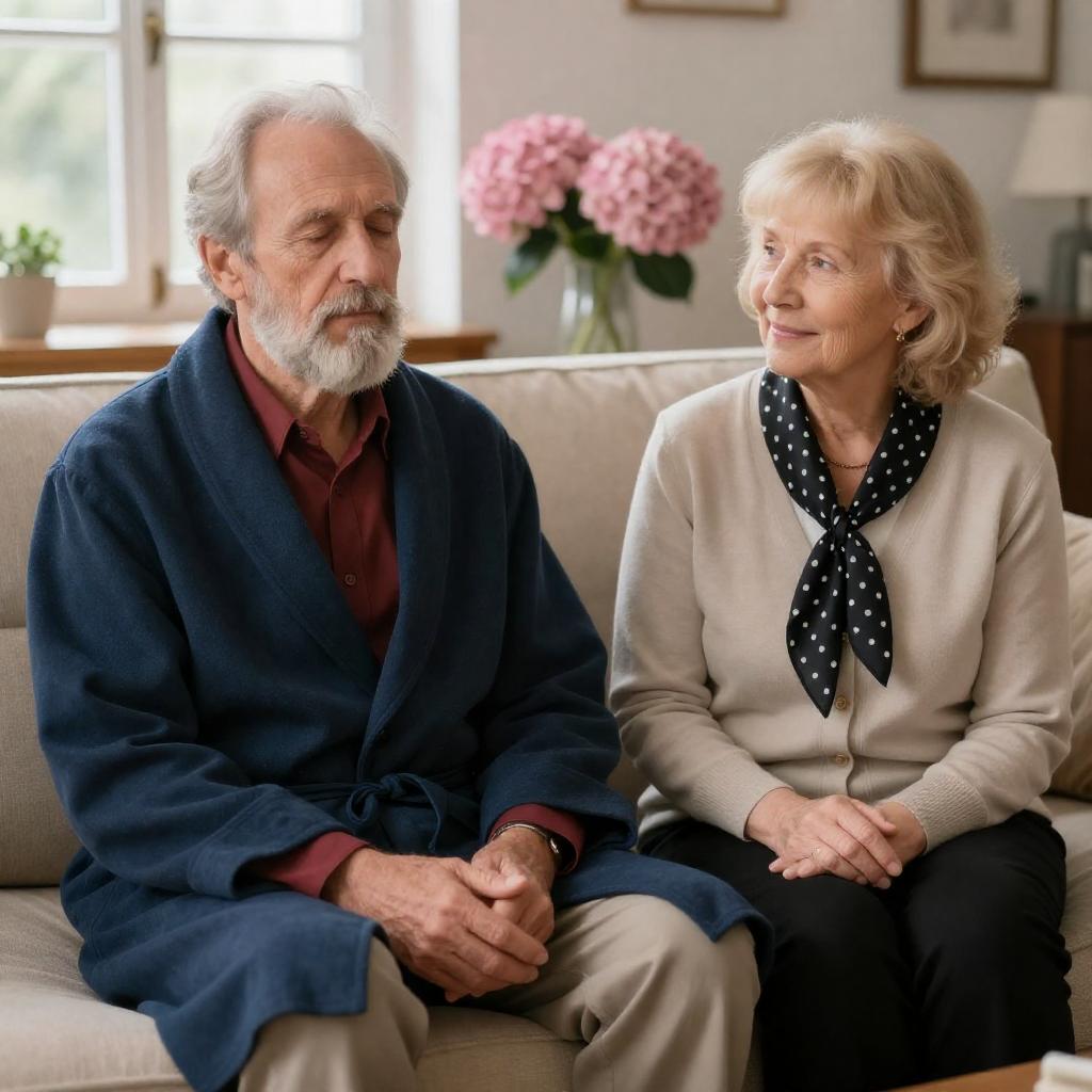 Older couple sitting outdoors on folding chairs. Man with bald head, red checkered shirt, holding brown thermos. Woman with white hair, brown jacket, holding blue cup. Green cooler with blue bottle, white cup, and bowl in front. Grass field, forest background. Man's expression neutral, woman's expression thoughtful. Daylight.