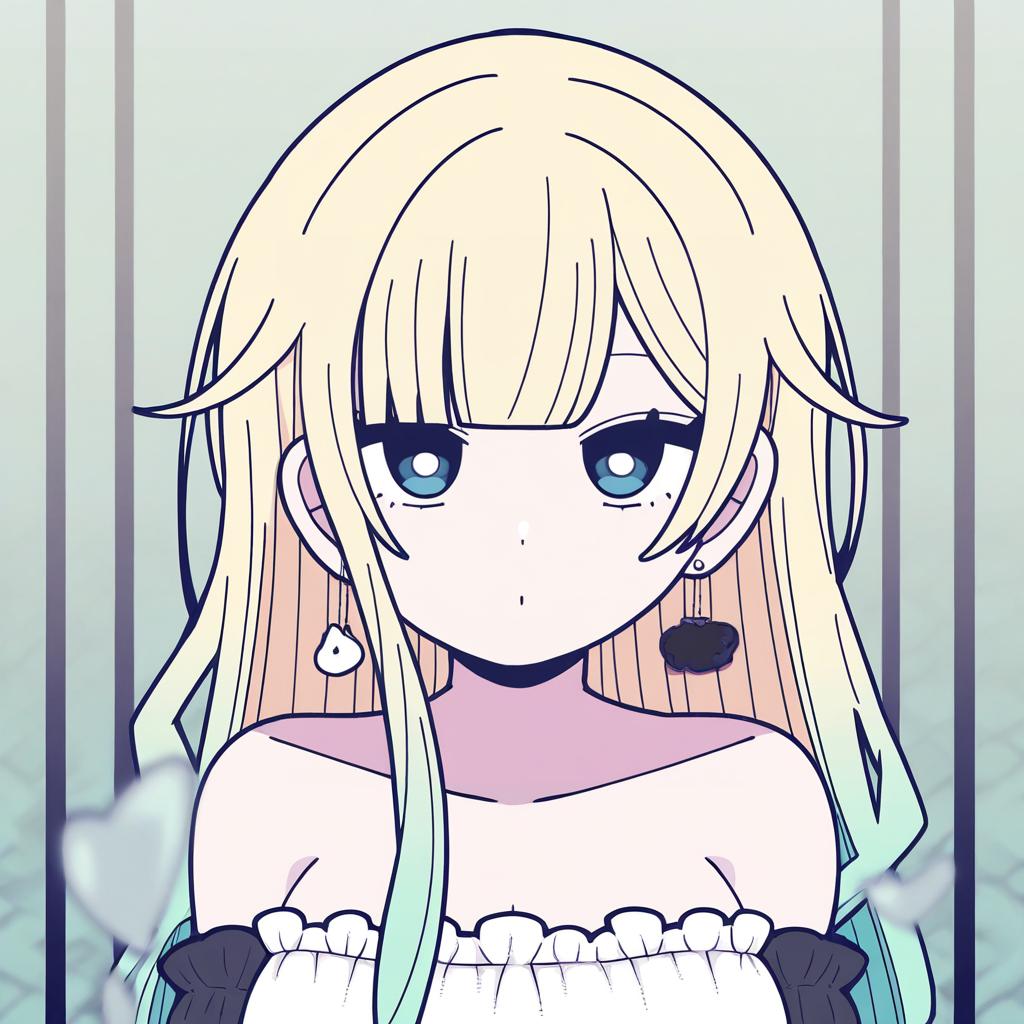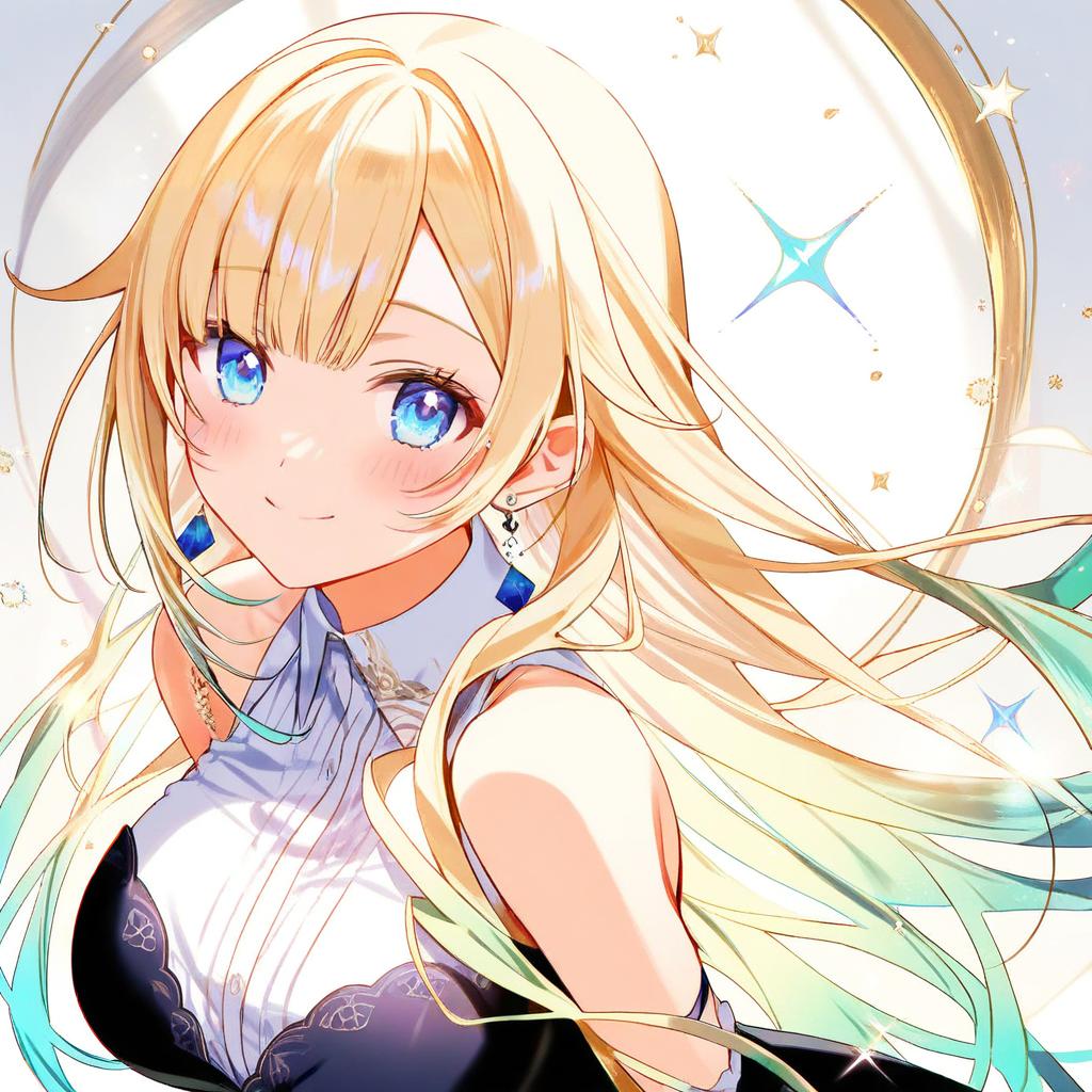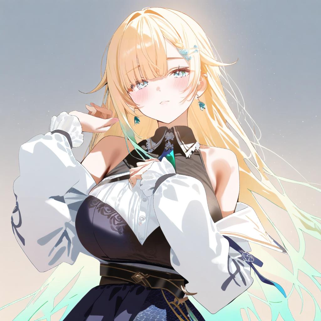 Aizawa ema, vspo!, 1girl, blue eyes, blonde hair, gradient hair, very long hair, blue hair, green hair, long hair, blunt bangs, hair flaps, large breasts, bare shoulders, virtual youtuber, virtual youtuber, earrings, by artist jiru (jirufun), animagine