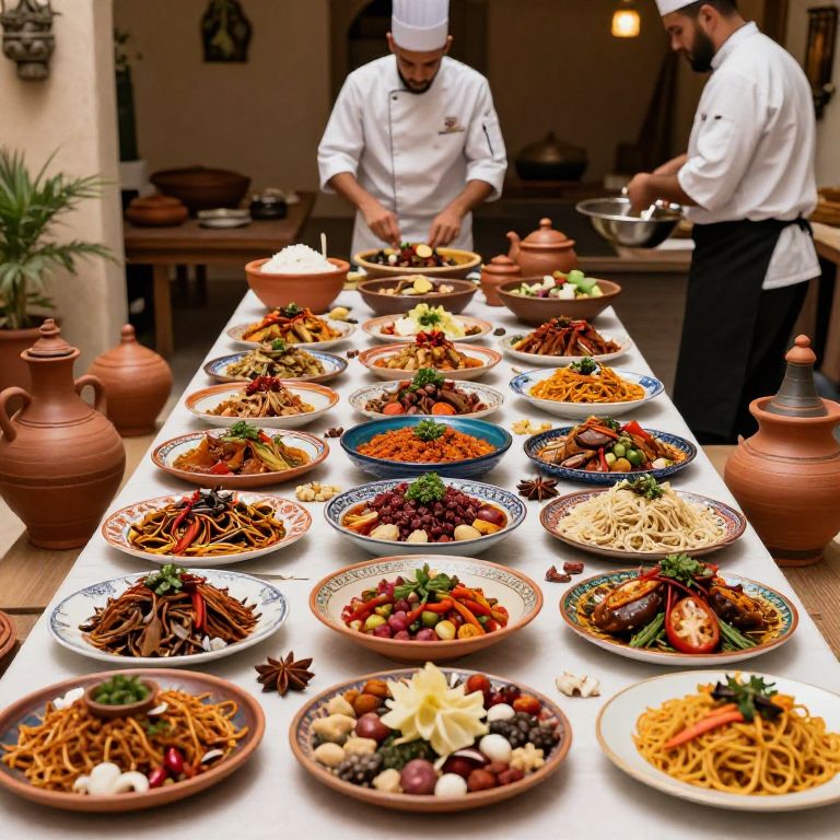 Cultura culinary experience with a table full of diverse traditional dishes from various cultures, vibrant spices and ingredients displayed, rustic setting with handmade pottery, chefs in action, sensory rich visual feast evoking the essence of cultural identity