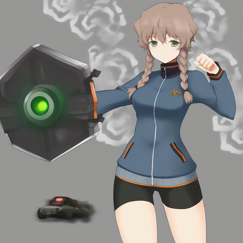 Digital anime-style illustration of a young female character with green eyes and brown hair styled in twin braids. She is wearing a blue zip-up jacket with orange and black accents, black bike shorts, and holding a futuristic black shield with a glowing green center. The background is a neutral gray with smoke-like effects and a small, blurred car visible in the distance.
