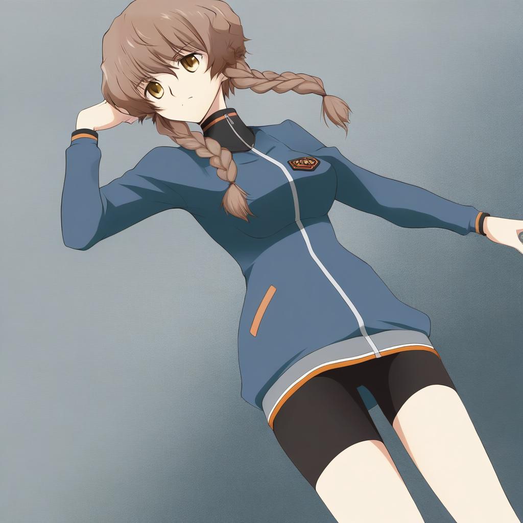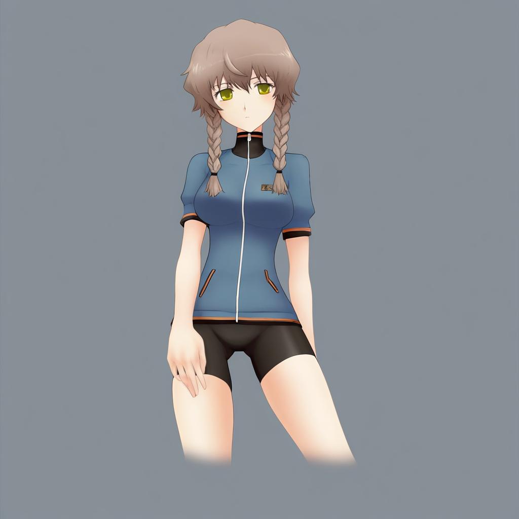 Amane suzuha, steins;gate, 1girl, yellow eyes, green eyes, brown hair, long hair, twin braids, medium breasts, bike shorts, by artist gale kawaii, leet