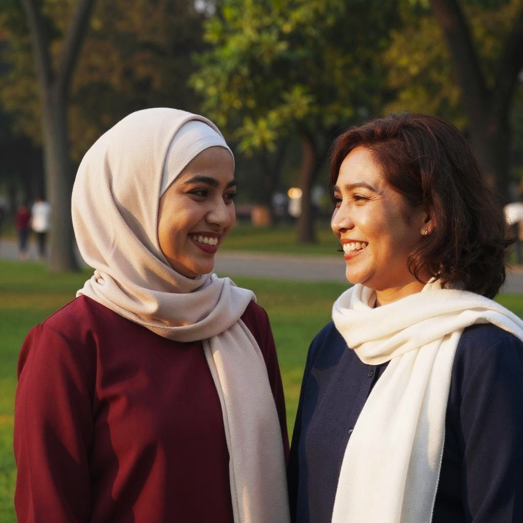 Two women smiling and looking at each other in a park during golden hour. One woman is wearing a beige hijab and a red top, while the other has short brown hair and is dressed in a navy blue top with a white scarf. The background features green trees and soft sunlight, creating a warm and joyful atmosphere.