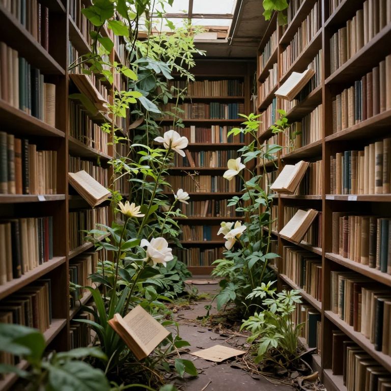 An abandoned library filled with books that grow and bloom into living, whispering plants, each page turning itself through joyful exhaustion.