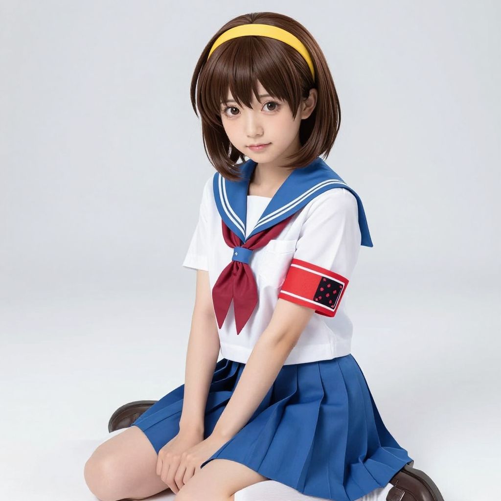 Masterpiece, best quality, highres, 1girl, suzumiya haruhi, solo, kita high school uniform, blue sailor collar, sailor collar, blue skirt, brown hair, short hair, brown eyes, armband, hairband, medium hair, ribbon, socks, medium breasts, cowboy shot