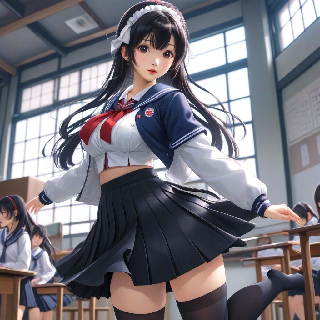 Digital anime drawing of a cute, brown-haired girl in a blue sailor school uniform with red bow, standing in a bright classroom with two other students and