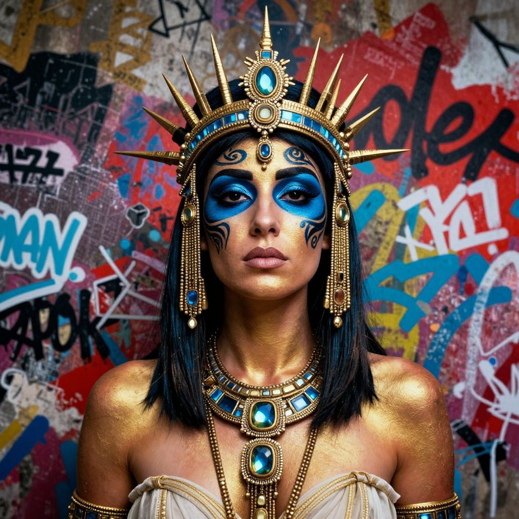 The image presents a striking and vibrant portrait of a woman, reminiscent of Cleopatra, adorned with elaborate and ornate accessories. Her face is painted with intricate patterns, featuring bold blue and black designs that contrast sharply against her golden skin. She wears a crown with spikes and a necklace that appears to be made of precious stones, adding to her regal appearance. The background is a chaotic mix of graffiti, text, and abstract shapes, creating a sense of urban decay and rebellion. The colors are bold and varied, with shades of red, blue, and gold dominating the scene. The overall composition is dynamic, with elements seemingly layered and overlapping, giving the image a surreal and psychedelic feel. The juxtaposition of the woman's classical beauty with the gritty, modern elements of the background creates a striking contrast, evoking a sense of timelessness and modernity.