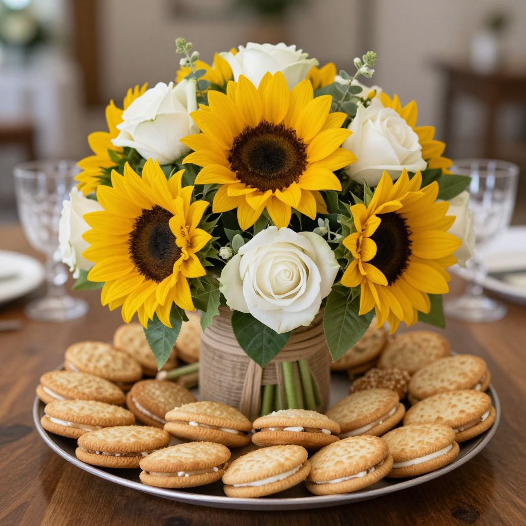 Country sunflowers and white roses elegantly arranged as a centerpiece atop a plate surrounded by golden sandwich cookies, creating a rustic yet sophisticated bridal/wedding shower party display.