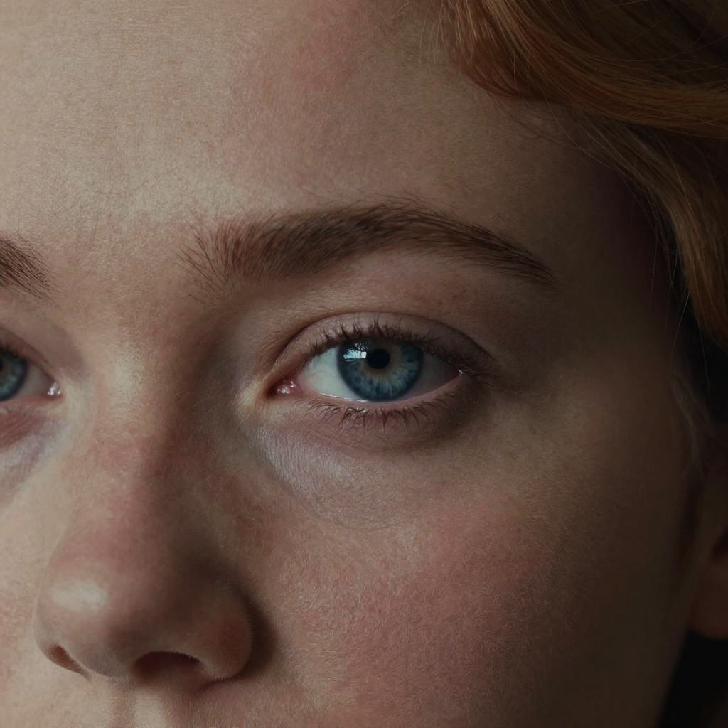 Kodachrome, 1970s, (8k, RAW photo, highest quality), beautiful girl, eye focus, close up, dress, sharp focus, (detailed eyes:0.8), dark blue eyes, defiance512, (looking at the camera:1.4), remarkable detailed pupils, (highest quality), (best shadow), intricate details, interior, ginger hair:1.3, (dark studio:0.5), muted colors, RAW candid cinema, 16mm, color graded portra 400 film, remarkable color, ultra realistic, textured skin, realistic dull skin noise, visible skin detail, skin fuzz, dry skin, shot with cinematic camera