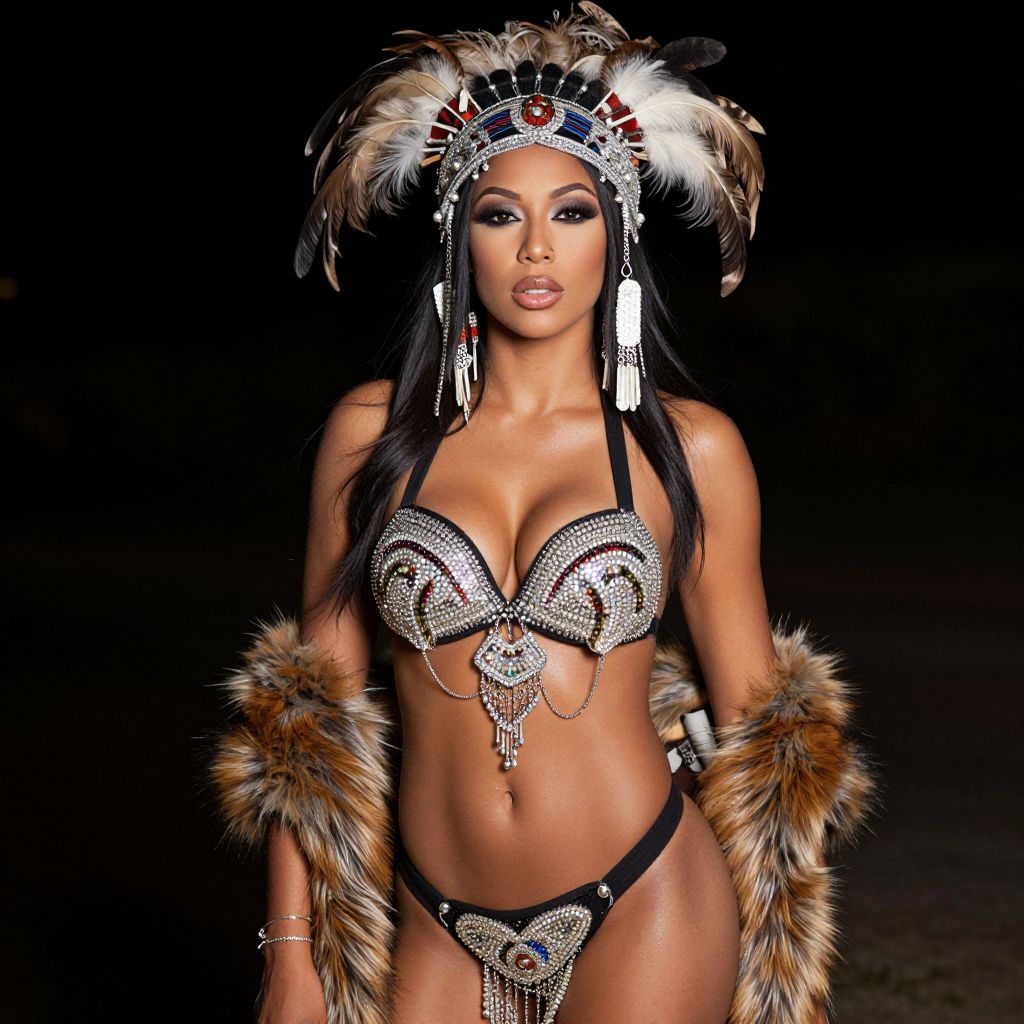 Photograph of a stunning woman with dark skin and long black hair, wearing an elaborate Native American-inspired outfit. She has a sparkly silver bra and matching bottom, adorned with intricate beadwork and silver chains. Her head is decorated with a large, feathered headdress, and she has fur cuffs on her arms. She has dramatic makeup with smoky eyes and full lips. The background is dark, making her outfit stand out brightly.