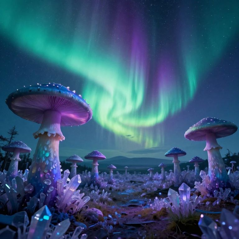 An ethereal landscape unfolds under the mesmerizing aurora borealis, where colossal, whimsical mushrooms stretch towards the shimmering lights of the celestial vault. The scene is viewed from an elevated perspective, revealing intricate crystalline formations adorning the mushroom caps and stems. A captivating color gradient transitions from deep purples and blues at the base to vibrant greens and iridescent hues near the tops, creating a sense of enchantment. This surreal vista evokes a profound sense of wonder and tranquility amidst its otherworldly beauty, as if plucked from the pages of a fairy tale or the depths of a vivid dream.