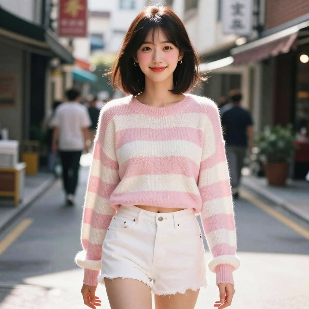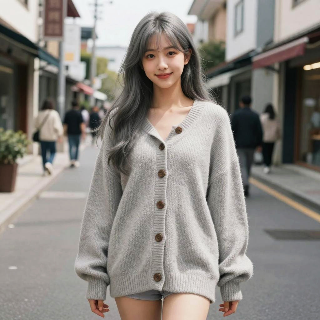 (extremely detailed CG unity 8k wallpaper), (masterpiece), (best quality), (ultra-detailed), (best illustration), (best shadow), (photorealistic:1.4), 1girl on street, Kpop idol, ((very oversize sweater, buttoned sweater, open sweater)), (grey hair:1.1), collarbone, no panties, (midel breasts:1.3), looking at viewer, smile, full body