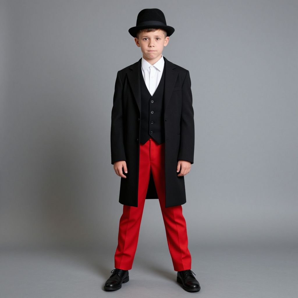 Photograph of a young boy with pale skin, wearing a black hat, long black coat, white shirt, red trousers, and black shoes, standing