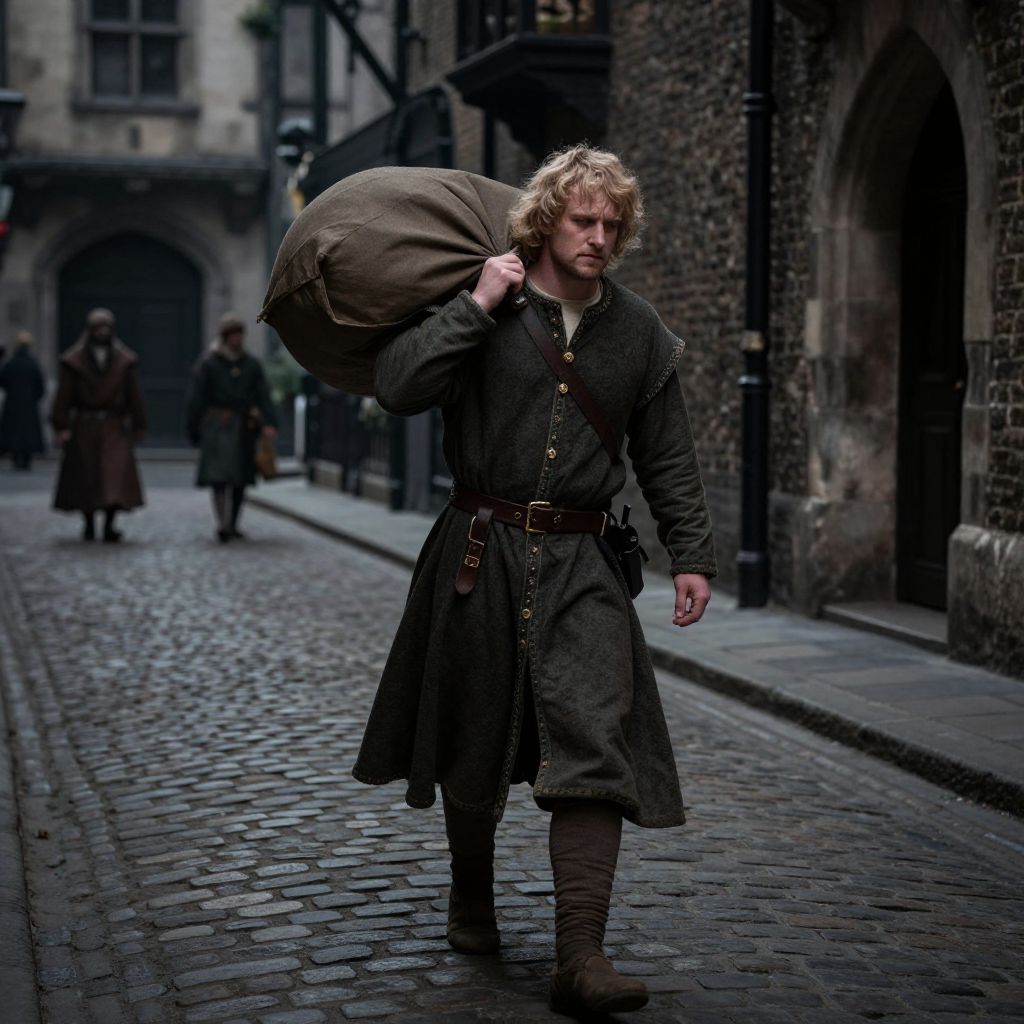 A man in medieval attire, carrying a large bag, walks cautiously through a dimly lit, cobblestone street in 14th-century London.
